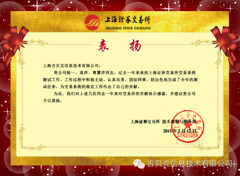 近日,吉貝克喜獲上海證券交易所的表揚(yáng)信。上證所高度肯定了吉貝克團(tuán)隊(duì)的工作成績。吉貝克在2014年承擔(dān)上證所的交易系統(tǒng)測(cè)試工作,以嫻熟的技術(shù)、優(yōu)質(zhì)的服務(wù)為前提,以為客戶創(chuàng)造最高價(jià)值為己任,嚴(yán)把產(chǎn)品質(zhì)量,為交易系統(tǒng)的穩(wěn)定運(yùn)行做出了突出的貢獻(xiàn)。信中特別點(diǎn)名表揚(yáng)了我司陸一、袁洋、曹翼翔同志,稱贊這三位同事積極主動(dòng)、認(rèn)真負(fù)責(zé)、團(tuán)結(jié)同事。